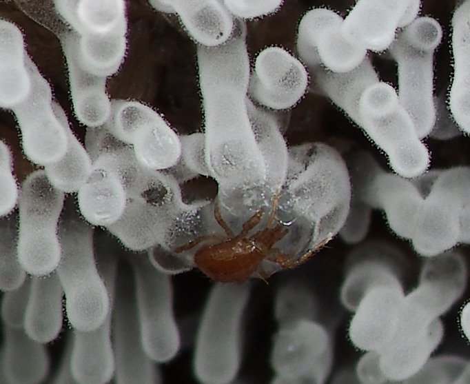 Zebra: Ощущение, что могут переваривать насекомых тоже есть. Однако про миксомицеты пишут, что активно питаются (да и вообще - просто питаются) они только на стадии плазмодия, когда быстро набирают массу. Потом, когда появляются спорангии - уже "на диете". Так что здесь, скорее всего, клещик просто нарушил тонкую оболочку свежего плодового тела и увяз - выбраться не может.