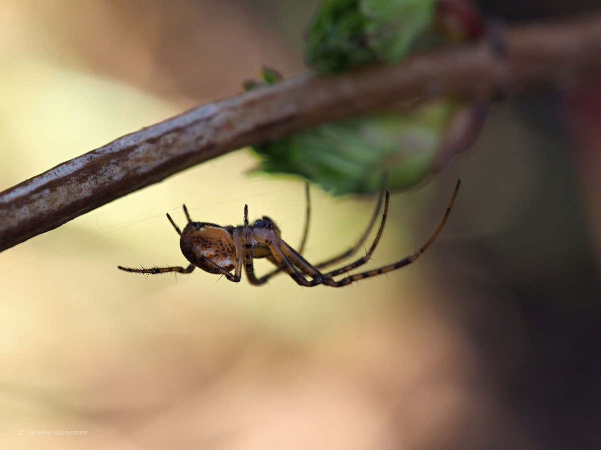 Калиновый куст дал приют нескольким паукам разных видов. Этот паучок оказался самым крупным (брюшко приблизительно 5-6мм) и красивым. Он бегал по паутинке между двумя ветками, чем и привлёк моё внимание...
