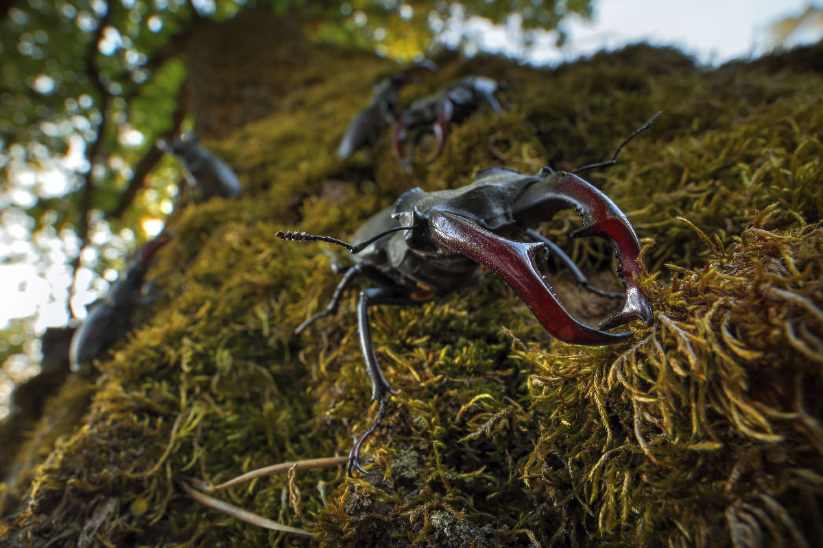 Приходилось наблюдать еще один интересный момент. На другом дубе на уровне 2-х метров от земли из расщелины тоже сочился сок, кроме бабочек-адмиралов и шершней там паслась уйма бронзовок которые прям по въедались в трещины коры и торчали только их спины словно изумруды и тут прилетел жук -олень и по-хозяйски рогами - словно гвоздодером принялся их выдергивать и бросать на землю. прикольно блин!