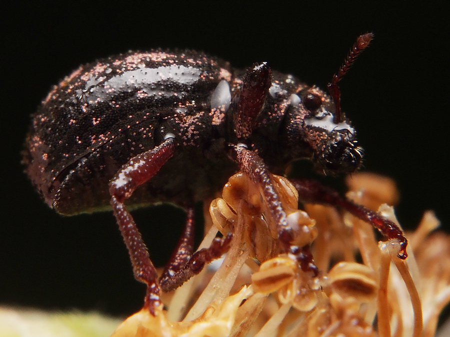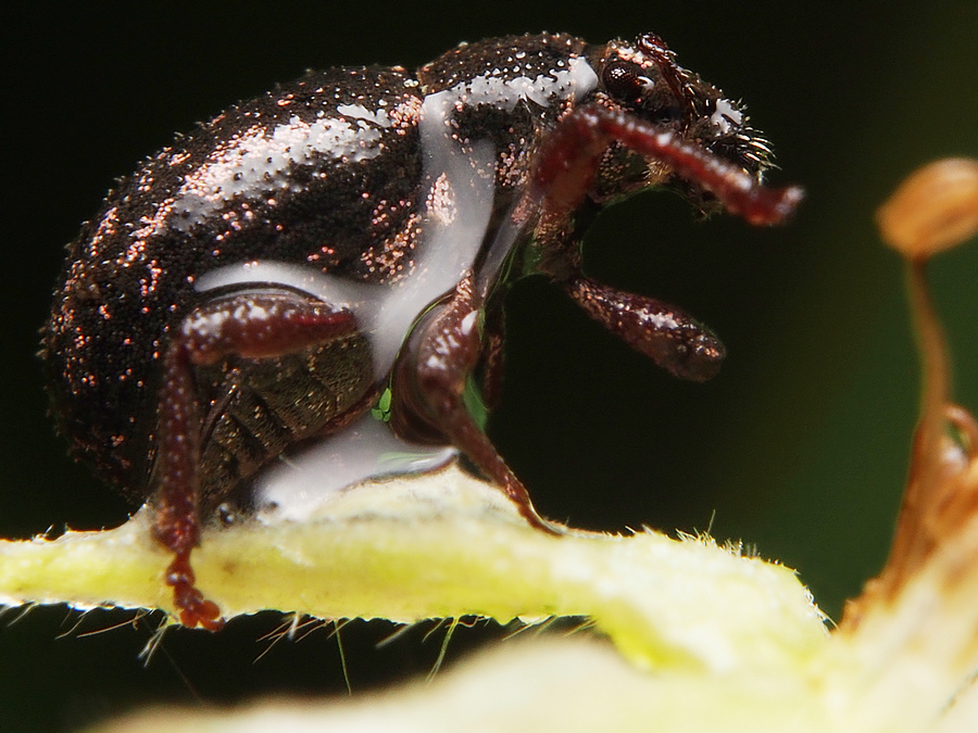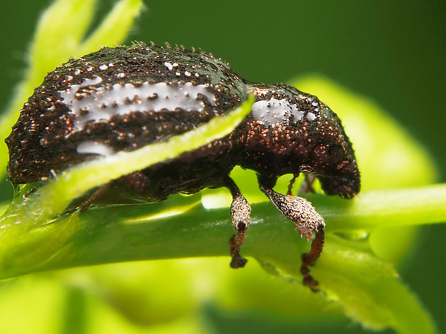 Разумеется, я начал фотографировать этого слоника, что ему категорически не понравилось. Он попытался возразить-убежать или спрятаться. Но, не тут-то было. По-видимому, поверхностное натяжение полностью обволакивающей жука воды оказывало попыткам жука двигаться ощутимое сопротивление.