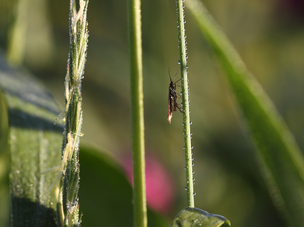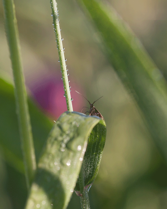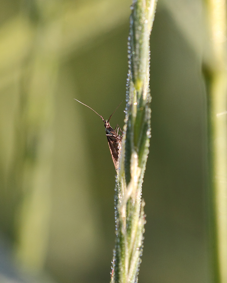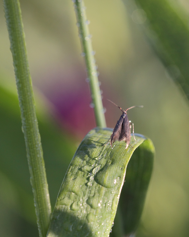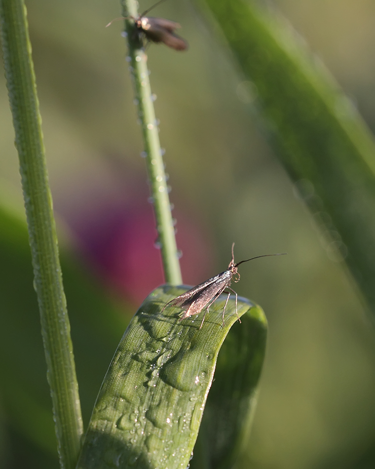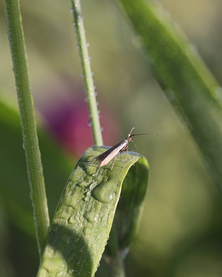 В куртинке травы жизнь била ключом! Несколько длинноусых молей то и дело появлялись откуда-то из зарослей, суетливо бегали по травинкам, перепархивали с места на место и вновь исчезали. Привлекли к себе мое внимание ещё вспышками золотисто-желтого света от их блестящих крылышек. Свет и цвет этот, впрочем, оказалось не так просто поймать. Вскоре я нашел-таки центр их тусовки (невеста, сидящая на травинке и не желающая показать личико) и приспособился ловить шустрых кавалеров в объектив.