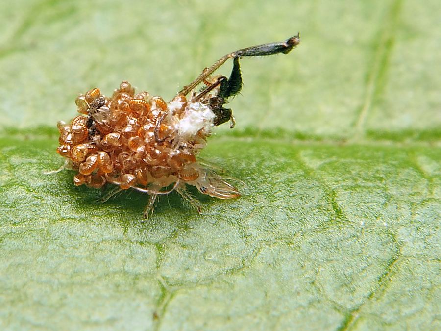 Личинка оказалась непривычно маленькой, крошечной, даже-при двойном увеличении и с кропом. Вряд ли все эти скорлупки-от "наетой" личинкой "дичи". Наверное, просто насобирала мусора по дороге. Хотя, прожорливость личинок златоглазки хорошо известна.