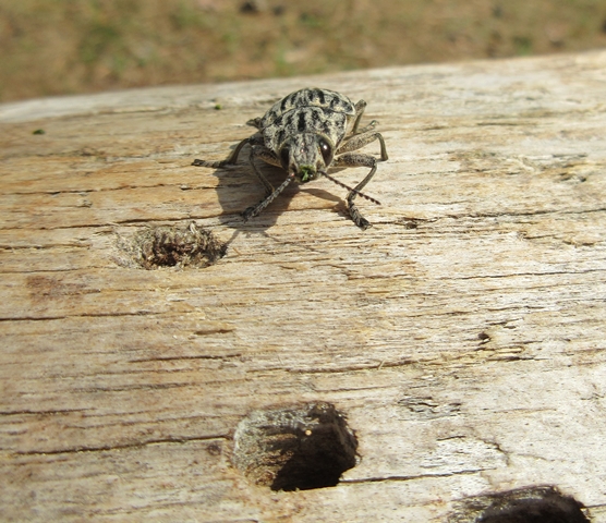 Жука встретили сегодня в смешанном лесу. Он не был против и мы посидели с ним на бревне. Он что-то жевал, разрешил себя погладить и пофотографировать. И вообще, казался заторможенным. Потом надоели мы ему и он резко улетел. Что за жучара?