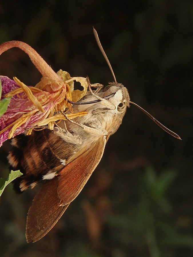 К одному из них она меня и направила. Бражник сидел на цветке, и при виде меня заработал крылышками. Однако, не улетел, остался на цветке, причём, увядающем. В первый момент это меня не удивило. Я немного поснимал бражника, а потом обнаружил, что хоботок бабули застрял в цветке, точнее-прилип к нему изнутри.