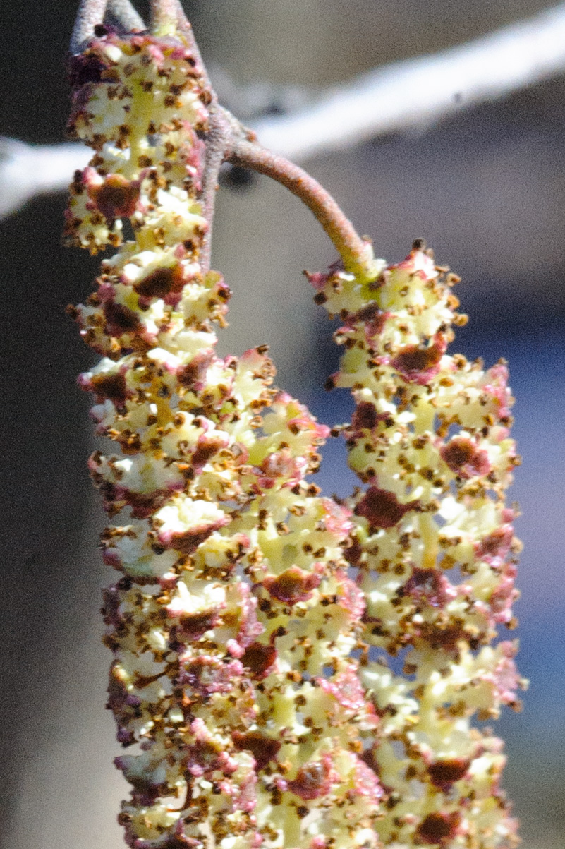 Несмотря на то что сережки ольхи и ивы кажутся похожими, при внимательном изучении оказываются очень разными. Среди серёжек различают тирсы (ольха, берёза, лещина), простые кисти и колосья. Сержка - это на самом деле сложное соцветие, а каждый элемент такого соцветия представляет собой не отдельные цветки, а целые группы их, то есть мелкие, вторичные соцветия, иногда даже другого типа, чем сама серёжка. На фото отдельные цветы - это мелкие темные точки, которые сидят на общей толстой ножке.