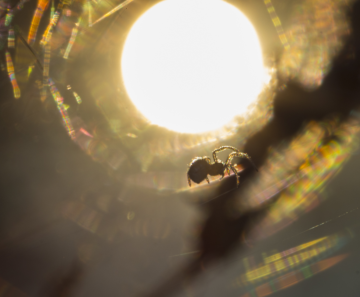 Паучок и мамаша, паучок шустро бегал по паутине, а потом улетел, было ветрено.