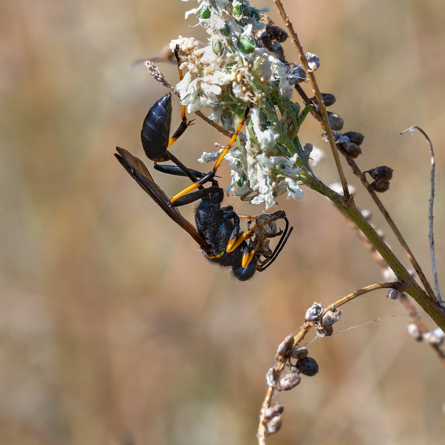 Конечно, Вы правы. Поскольку оса что-то делала с пауком, орудуя челюстями, в результате чего тело паука "скукоживалось", уменьшаясь в объёме, у меня возникло естественное подозрение, что она лакомится добычей. Через короткое время оса перелетала на другое место, продолжая и там "жевать" паука.