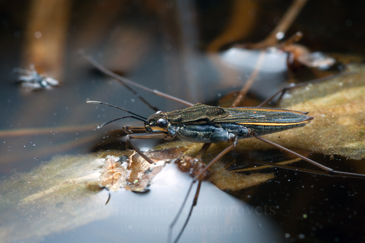 Прудовая водомерка (Gerris lacustris), одна из самых обычных в Европейской части России. Снимок сделан на лесной заболоченной прогалине в луже.