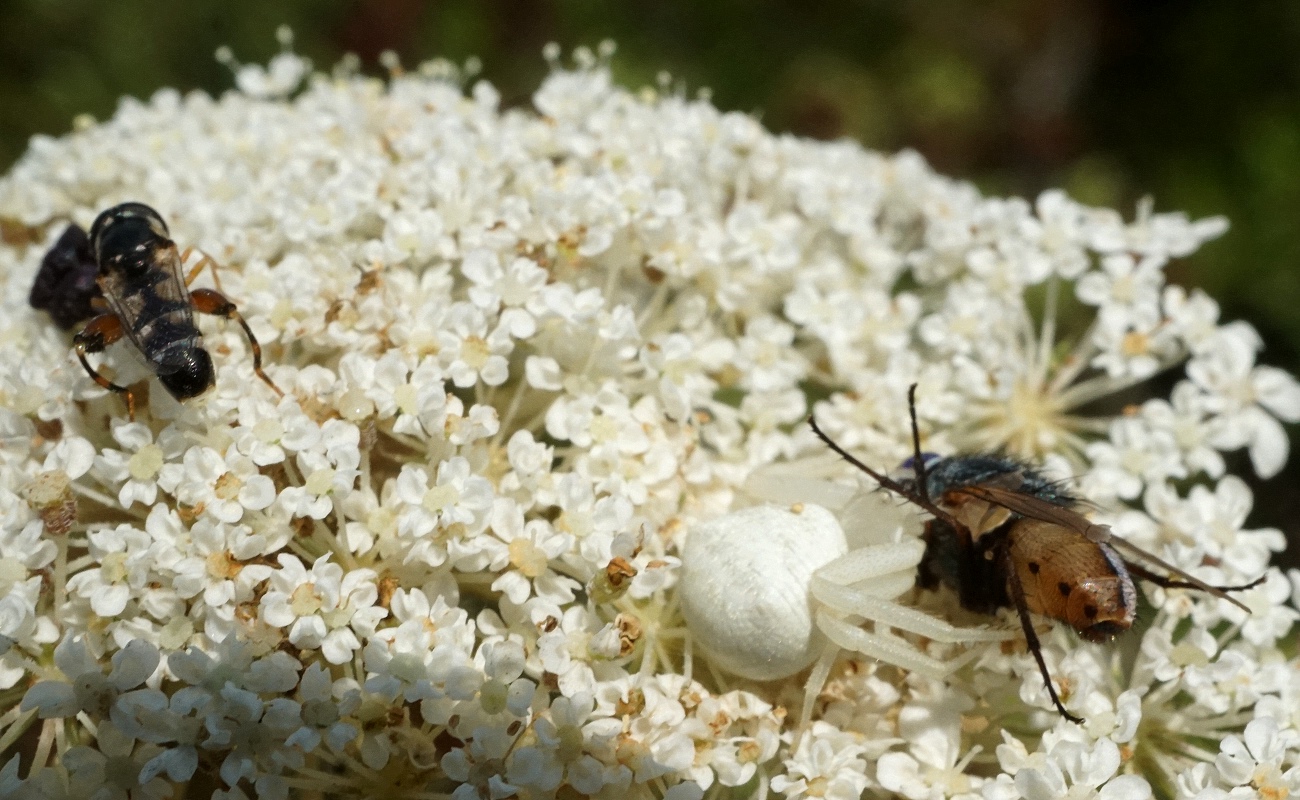 возвращаясь, увидел, что брошенная журчалка приходит в себя, а паук переключился на жирную и красивую муху.