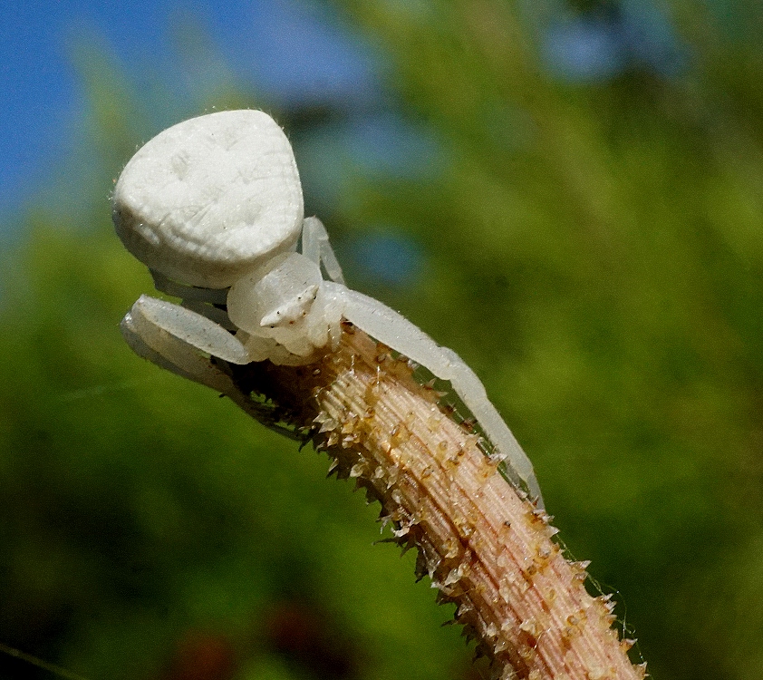 Мне рассказывали, что Даррелл описывал пауков-бокоходов, живущих долгое время на одном цветочке. Я это тоже замечал, а недавно ещё раз в этом убедился. Привожу серию аж из восьми фото, которые сделаны за три дня, встречаясь с паучком дважды в день, идя по одной дороге в лес и обратно.