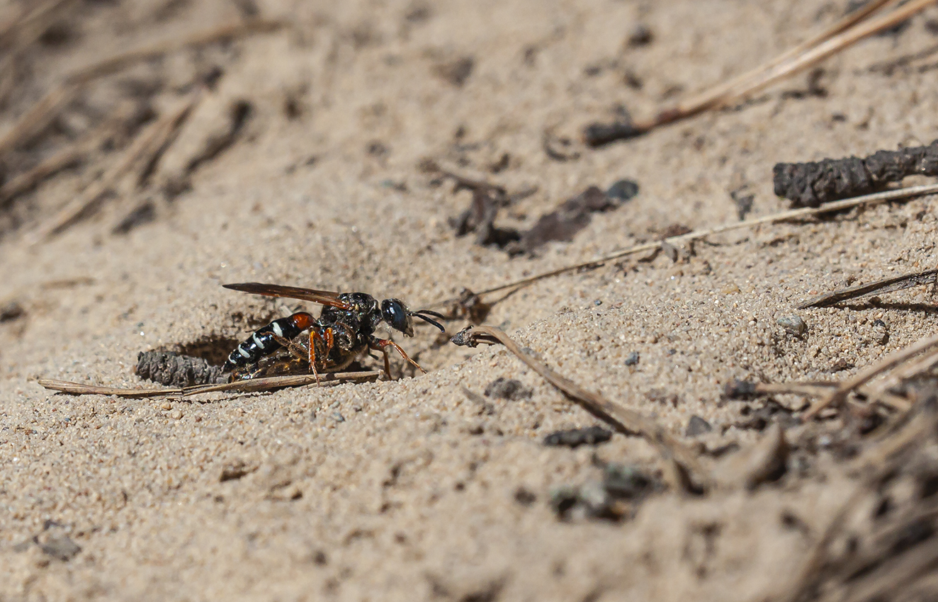 На песчаном пригорке между соснами кипела жизнь. Какие-то одиночные осы, часто держа что-то в лапках под брюшком, летали в 10-20 см над песком и лесной подстилкой, периодически присаживались и ненадолго исчезали из виду вместе со своим грузом. Как выяснилось, они вползали в норки, которых до того момента было не видно. А рядом крутились осы помельче - осы-блестянки и ещё какие-то мелкие мухи, которых привлекали те самые моменты, когда оса уходила в норку.