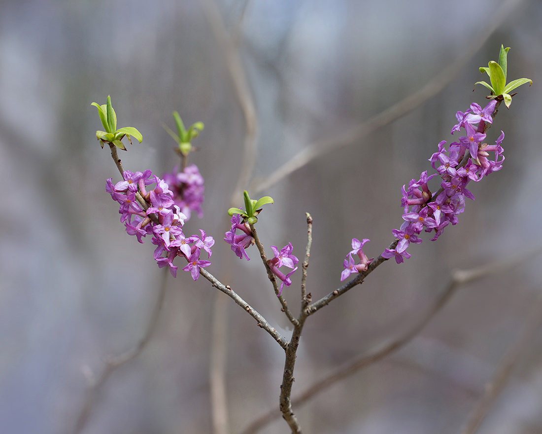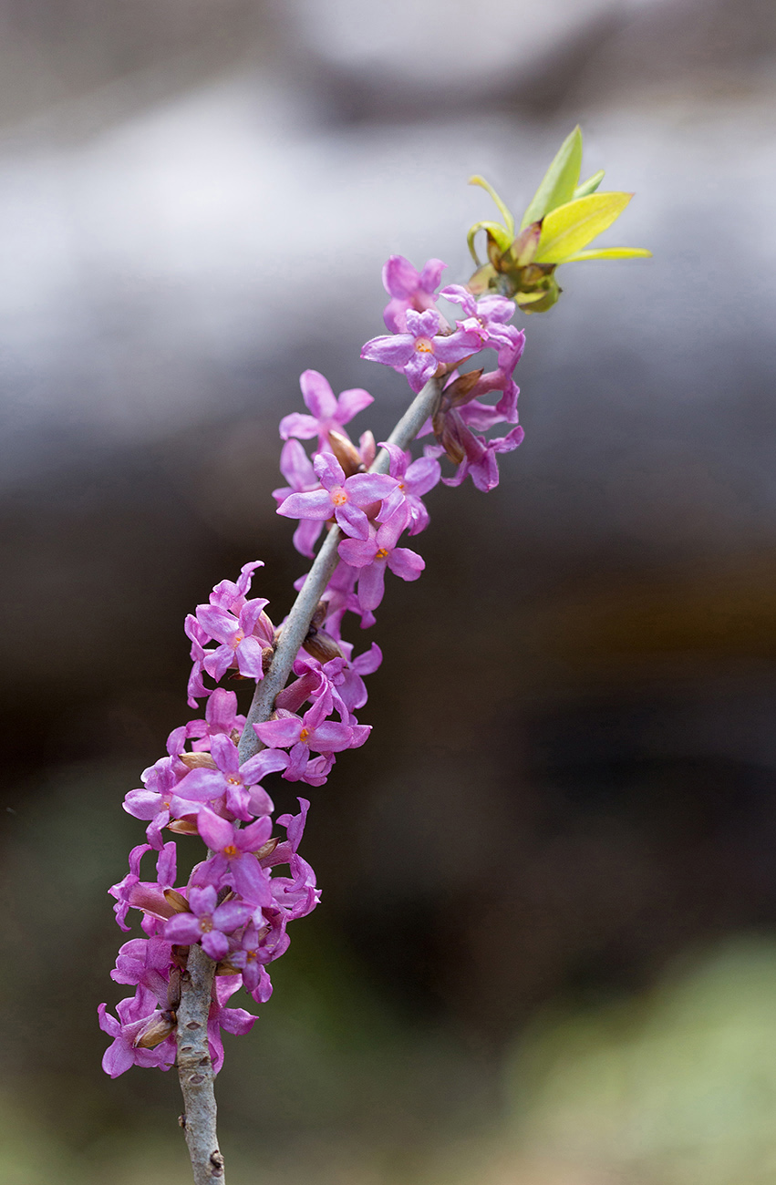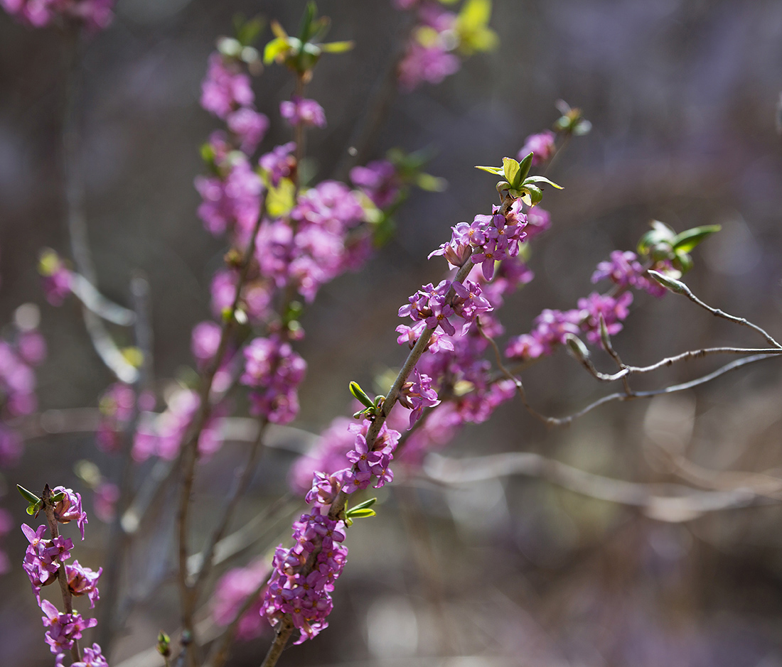 Весенние лики волчьего лыка, Daphne mezereum, сравнить не с чем, поскольку цветочков, хотя и немыслимое количество, но все они расположены в виде крохотных розовых бусинок на тонких нитках - побегах, почти не ветвящихся. Это не рододендроны и не сирень, хотя и не менее очаровательны при неожиданной встрече в лесу. К тому же с приятным ароматом. Но, если специально не присматриваться, то можно без усилий продефилировать мимо. Мне они встретились у края дороги - дюжина кустов среди осоки, и все были видны, если хорошенько напружинить глаза.