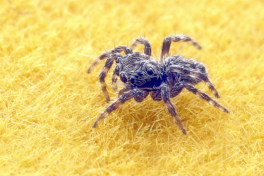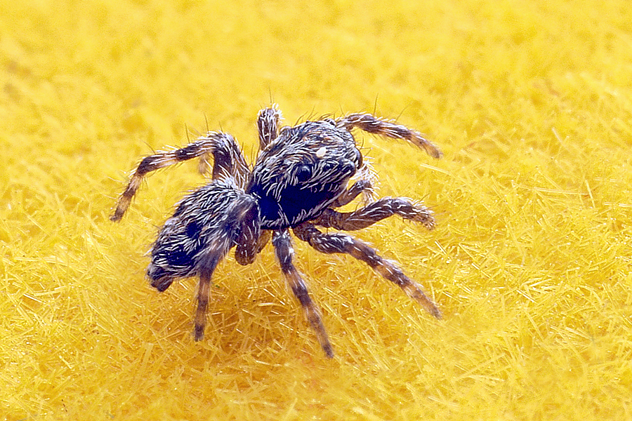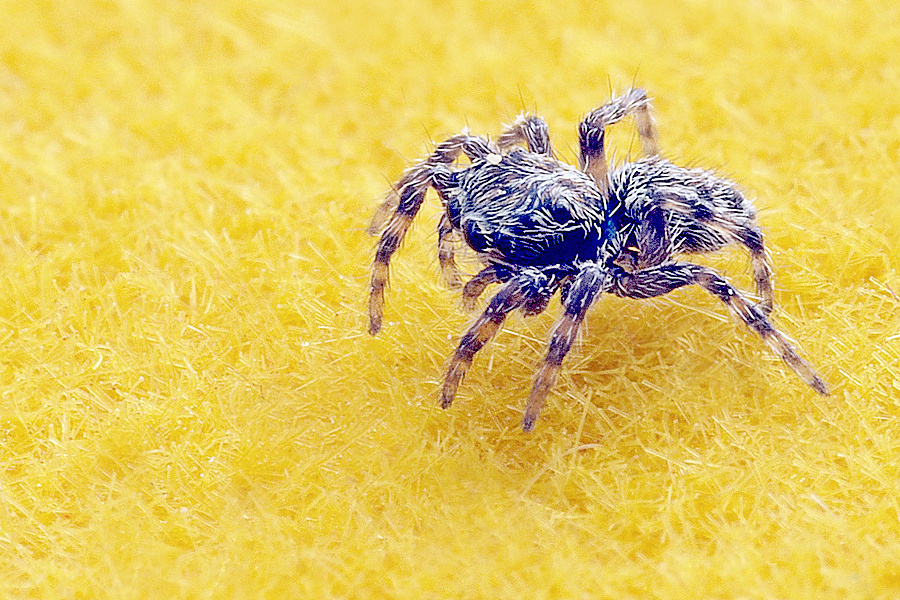На белой стерильности у окна снимать его не хотелось. Достал лист жёлтой бархатной бумаги и лёгкими понуканиями заставлял скакуна заползать-запрыгивать на бумагу. Он почти не сопротивлялся и сидел на месте потом довольно долго, не суетился и не бегал туда-сюда. Посему, фотографировать его было легко и приятно, за что пауку спасибо большое.