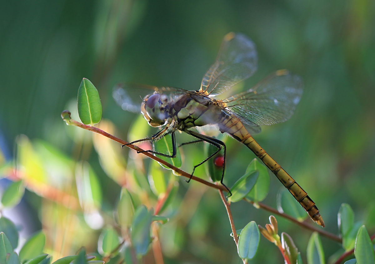 А в первый раз раз я была сильно удивлена, что, оказывается, жертвами росянки становятся не только мелкие насекомые. В этот вечер на ужин она завалила практически целого мамонта (стрекозу). Пытаясь заснять эту драму и размышляя о том, что стрекоза, похоже, пропала зазря, т.к. не переварить росянке такую добычу - подавится, вдруг заметила, что жертва шевелится. Подставила ей под лапки веточку. И - о, чудо! Подтянулась, напряглась и вытащила крылья из липких оков! Потом посидела на развесистой клюкве, немножко потрепыхала крыльями, как бы проверяя их готовность к полету - и улетела. Надеюсь, росянка найдет ей достойную замену себе по размеру - комаров да мух на болоте много.