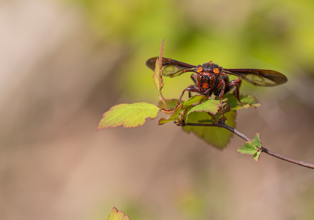 Вот такого огромного пилильщика встретил на подоразделе. Сидел на кустике грозно шевеля усами. Однако подлетевший мелкий жучек мигом согнал его. Улетел, только его и видели. Не таким уж он и грозным оказался