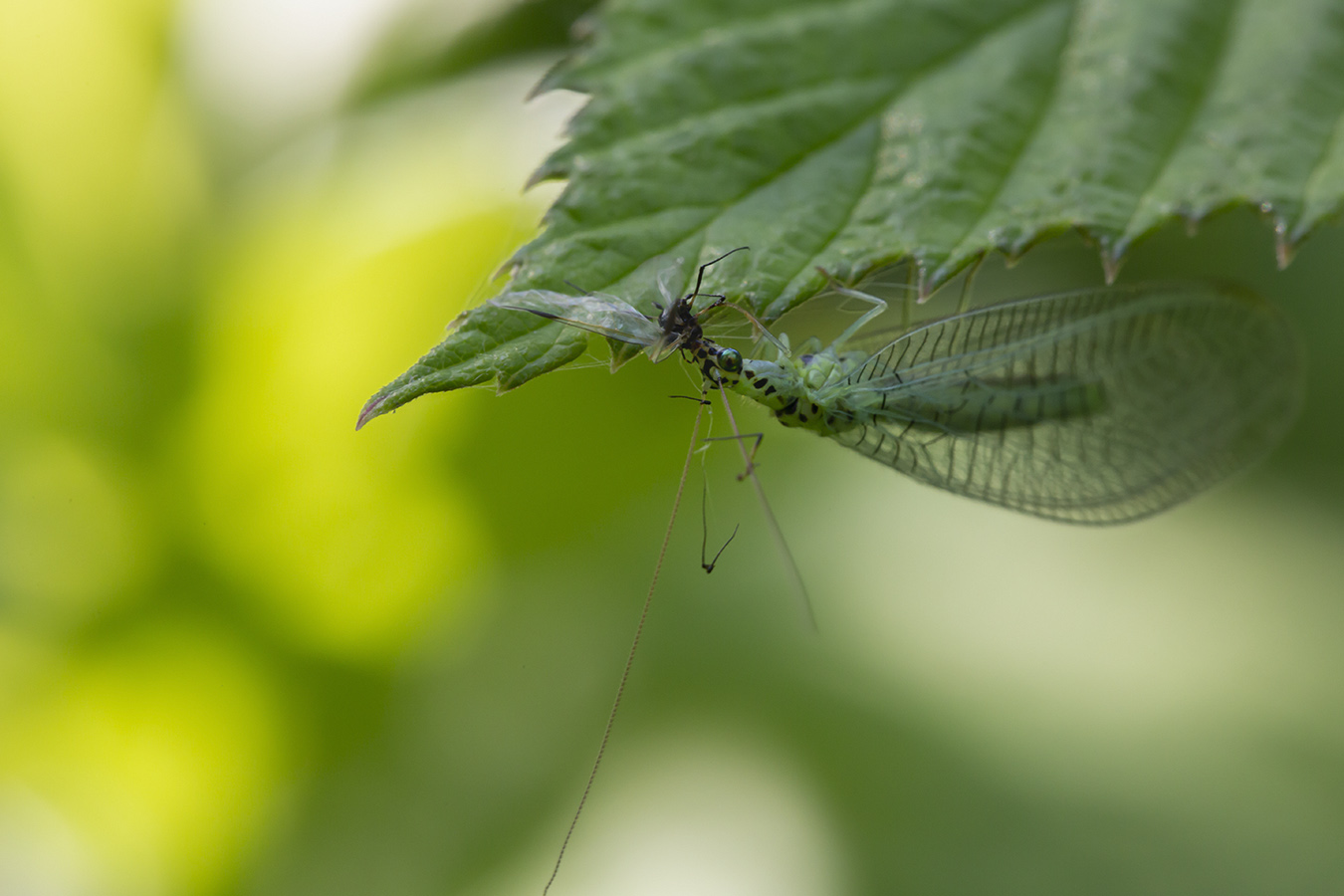 Почему-то в моем представлении златоглазки, эти легкие воздушные создания, которые только и делают, что похают как эльфы с листа на листок совершено безобидны. Я, конечно, знал, что ее личинки свирепые хищники смертельно опасные для самой мелкой живности типа тли и даже чуть поболее. Для меня было довольно неожиданно, что эти тихони и во взрослом возрасте очень даже не прочь перекусить чем -нибудь мясным. Очень удивился, когда обнаружил златоглазку которая неспеша завтракала поедая тлю. Завтрак длился около 15 минут. Не бог весть какое открытие, но все же интересно.