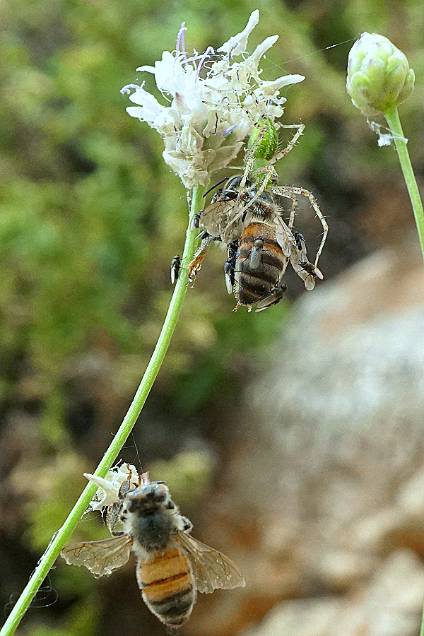 В итоге 4 пчелы пойманы пауками (Peucetia virescens) или рыси(3,4,5). Две - пауками-крабами (2,6). Муха (1)- тоже, по-моему, поймана рысью . И, наконец, не второстепенное, все процессы на цветах растения, которое называется яффская головчатка.