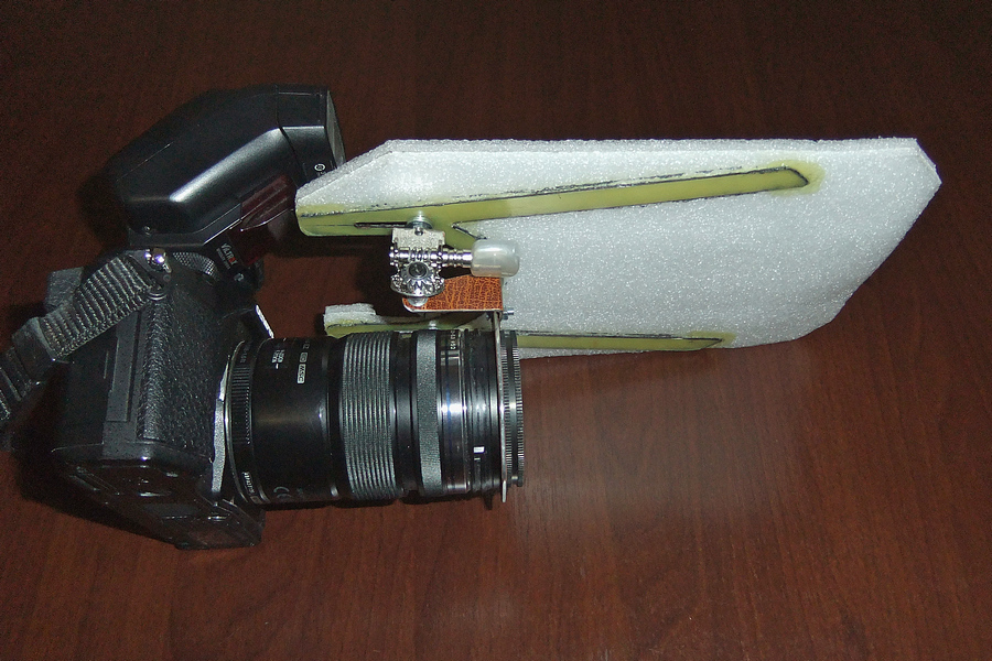 Известно, что чем больше площадь рассеивателя (в общем случае), тем лучше он работает. Мне же требовалось, при относительно малых габаритах листа вспененного материала, поворачивать (приподнимая относительно вспышки) в некоторых пределах этот лист, для удалённых обьектов съёмки.