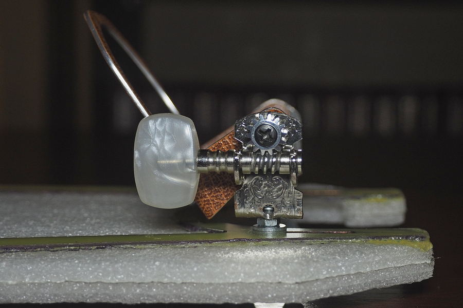 Поворотный механизм изготовлен из типовой колковой механики на три колка для гитары.