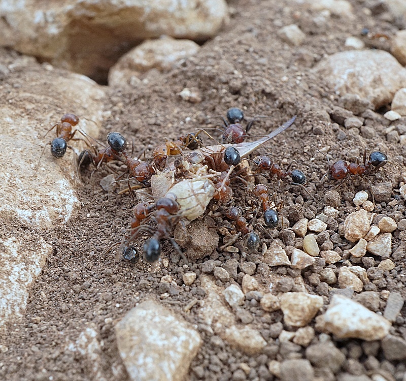 Идя по маршруту, заметил и снял, как муравьи тащат саранчу. На обратном пути их же снял возле подземного муравейника...