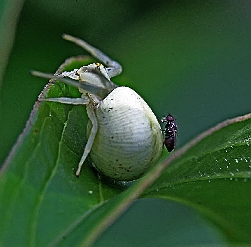 Мелкие мушки не боятся цветочного паука,ходят по нему,пускают слюни.Когда паук ловит другую добычу дружно собираются ему помогать её съесть.