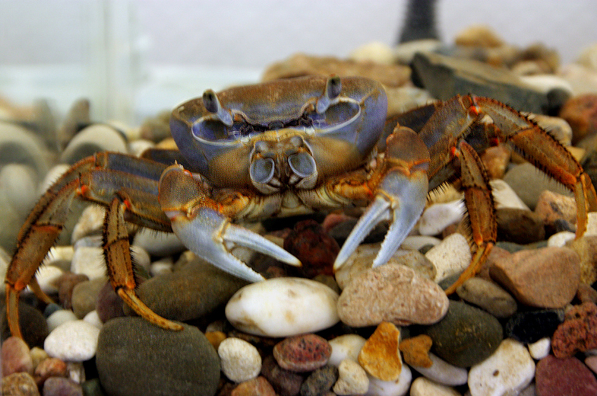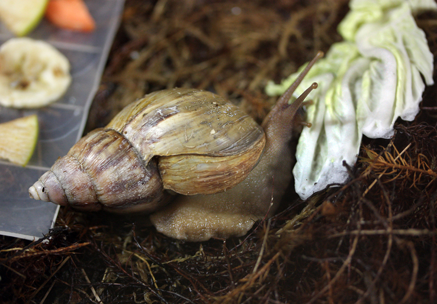 Внизу под пауком (5.) - шкурка птицееда, а вернее панцирь вылинявшего паука. Одни пауки линяют всю жизнь, другие....до половозрелости. Сначала покровы паука мягкие и бесцветные, а потом затвердевают на воздухе. В процессе линьки происходит и регенерация утерянных (в боях) конечностей. 6. Голубой краб (Cardisoma guanhumi) или "большой краб земли". Один из крупнейших (до 0,5 кг.), но до нашего камчатского ему, конечно, далеко, хотя по красоте (вариации окраски от голубого до коричневого) превосходит многих. Обосновался на тропическом атлантической побережье Америки, Бразилии, Колумбии и африканской Анголы. 7. Брюхоногий моллюск ахатина (Achatina fulica). Наиболее крупный из наземных улиток. Вредит бананам и цитрусовым в лесных районах Африки и Ю. В. Азии. Но молодь очень полезна в качестве ассенизаторов....поедает гниющие остатки растений и экскременты. В зоопарке же в ее меню входит всякие вкусности: морковка, яблочко, капустка...вон как уплетает! В отличие от птицеедов благоденствует, усиленно размножается. На остальных двух станичках попытаюсь рассказать о рыбах, земноводных и пресмыкающихся зоопарка.