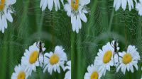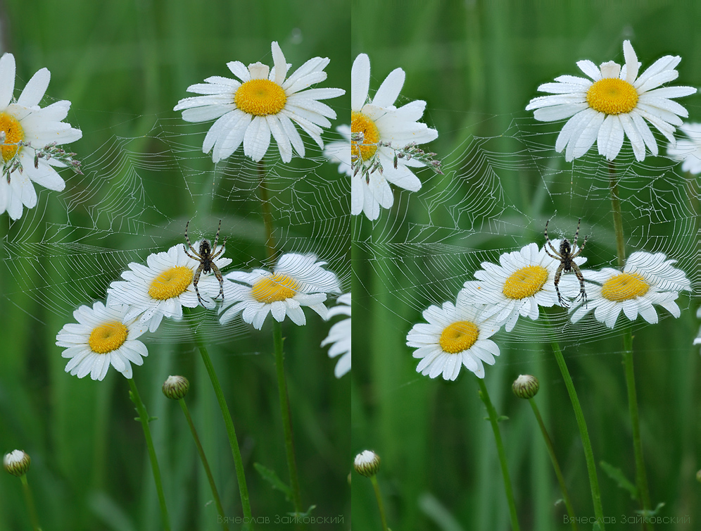 Что-то не очень понятны сентенции по поводу ромашек - мне кажется, что они как раз подчеркивают глубину, являясь "средним планом", ибо на заднем здесь трава, и расстояние между ромашками и травой ощущается очень заметно. Кстати, на 3D ТВ эффект ощущается очень сильно: паутинка выпирает из экрана наружу наверное на полметра )))