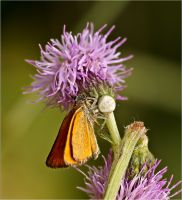Прошли дни. Вдруг гусеничка проснулась, и ей стало тесно, захотелось выйти из домика. Она с большим трудом открыла дверку, и её обдало весёлое солнышко и свежий ветерок. Устроившись на ромашке, стала оглядывать окрестности. Рядом на соседнем цветке по-прежнему трудился паучок. Заметив гусеничку, он открыл рот…