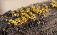 Это сумчатый гриб биспорелла лимонная (Bisporella citrina) или, возможно, близкий к ней вид. Многие представители р. Bisporella внешне очень похожи друг на друга и уверенно различаются по микропризнакам (размерыспор, их форма и т.п.).