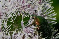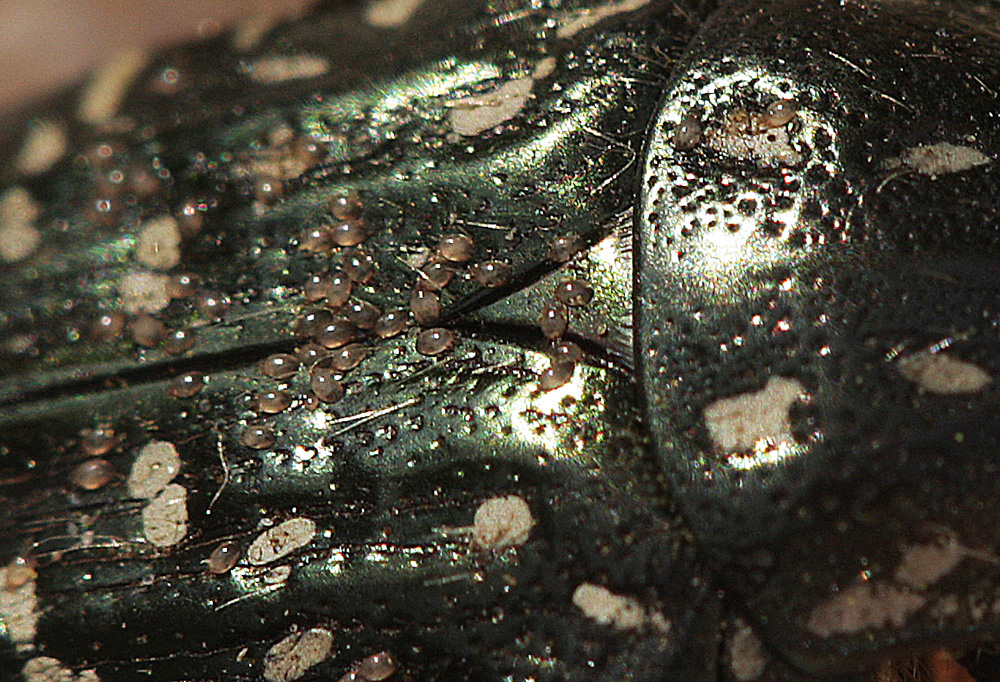 Рассматривая при большем увеличении волоски на спине,обнаружил на такой бронзовке что-то очень мелкое и непонятное.Возможно это клещи,хотя чаще встречаются красные.Если кто знает,подскажите.