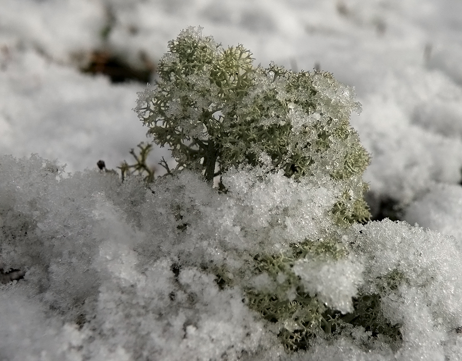 К сожалению когда шел снег был ветер и с одной стороны все лишайники были заметены полностью А с другой стороны образовались ямки из которых торчали опавшие сосновые иголки Сначала пытался убрать иголки но сделать это не потревожив снег не удалось После неоднократных попыток хоть немного убрать в кадре взял и перенес лишайник на чистое место А сегодня после двух суток снегопада снег сантиметров двсять закрыл их полностью Видимо сезон закрылся После трех часов хождения по лесу практически ничего снять не удалось Был один паучек миллиметра два три но бегал так быстро несмотря на снег что снять не получилось