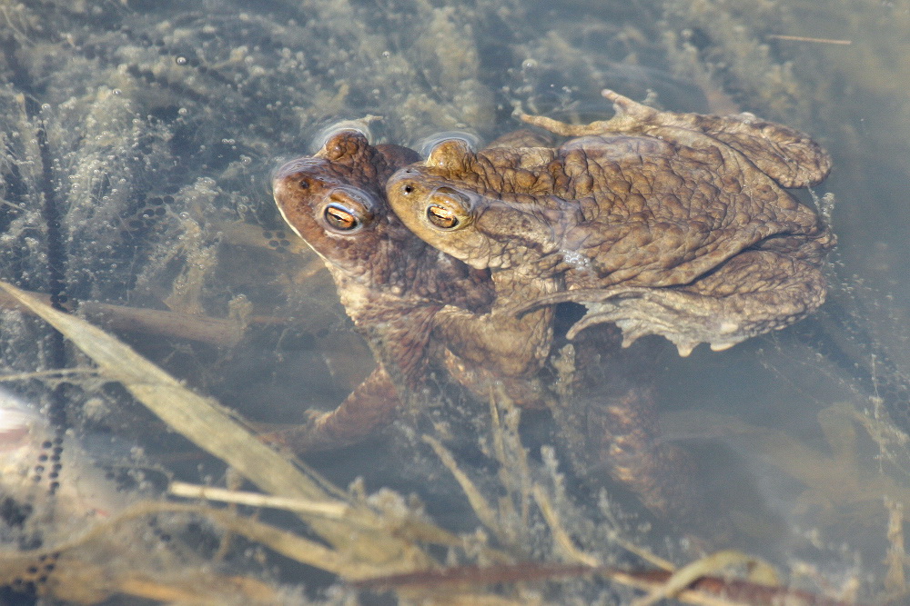 Счастливая встреча произошла вдали от водоема. Самец обычно едет с совершенно замученным видом, а у самки вид весьма решительный и целеустремленный. У меня это ассоциируется с выносом раненых с поля боя.