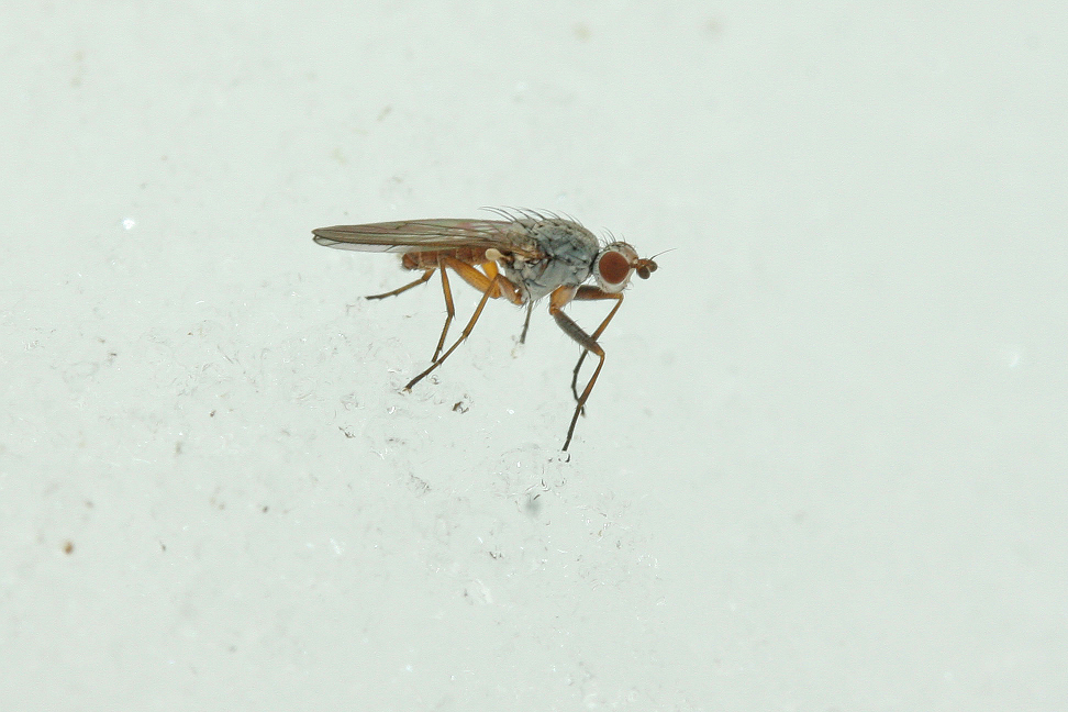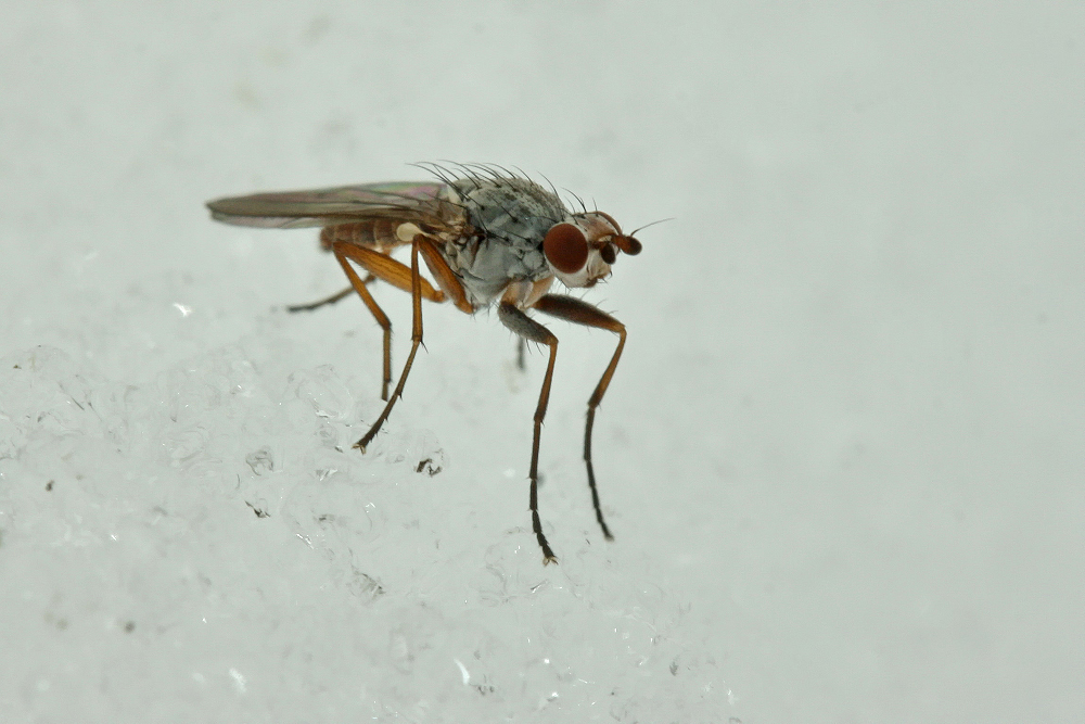 Отважный мух - из сем. шипокрылок (Heleomyzidae), они в спячку не впадают, а просто цепенеют и поэтому чаще всего попадаются на снегу даже в любое время зимы при оттепелях. Одно из характерных отличий- ровный ряд мелких шипов по краю крыла.