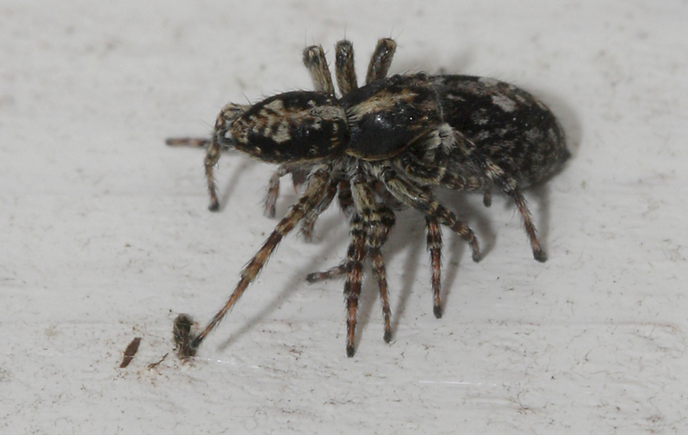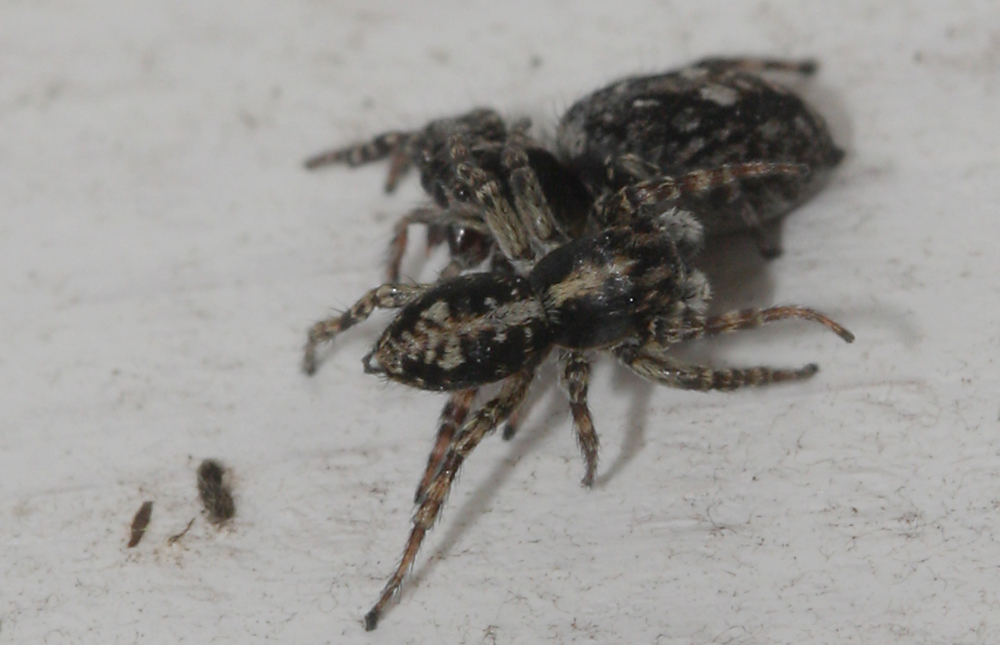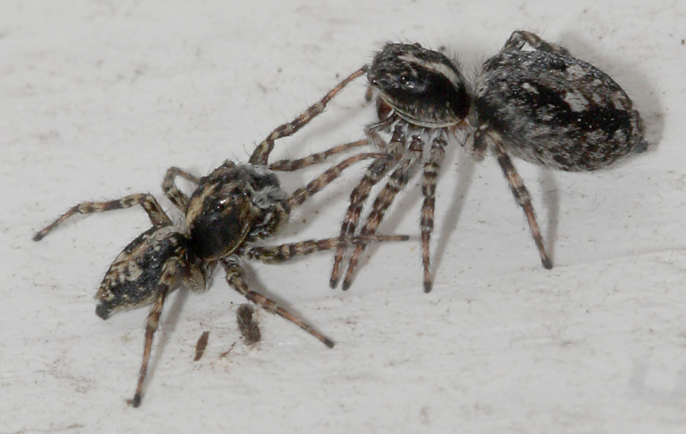 Эти скакунчики разыгрывали любовные сцены несколько раз.К сожалению, они очень шустрые.Возможно это Cyrba algerina. Кавалер более подвижен,кружит на расстоянии до 4-5 см,периодически подходя к самке спереди, а затем пробегая прямо через нее.