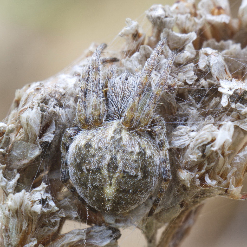 Летающей живности на приморских склонах практически нет, поэтому приходится выискивать, что поснимать. Если внимательно осматривать засохшие соцветия, можно найти довольно много мелких пучков, сидящих в засаде. Правда заметить их непросто, уж больно мелкие и маскируются хорошо. Кадр целиком, в кадре примерно 2 см.
