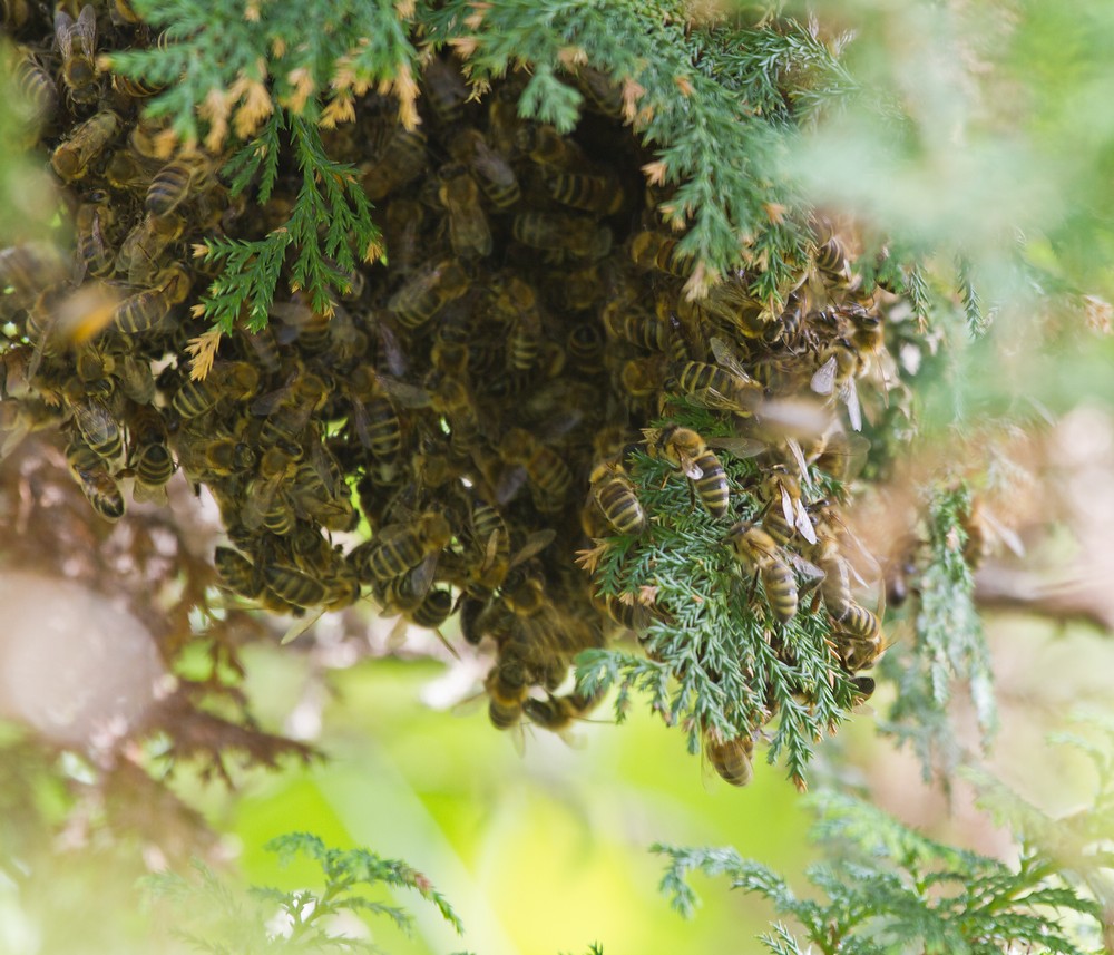 Удалось немного понаблюдать за вылетом роя из улья. Сначала пчелы, на первый взгляд беспорядочно, носились возле деревца. Затем их количество в воздухе уменьшилось, но зато можно было увидеть образование роя на дереве. Через пару часов все пчелы были в компактном рое, и практически не летали.