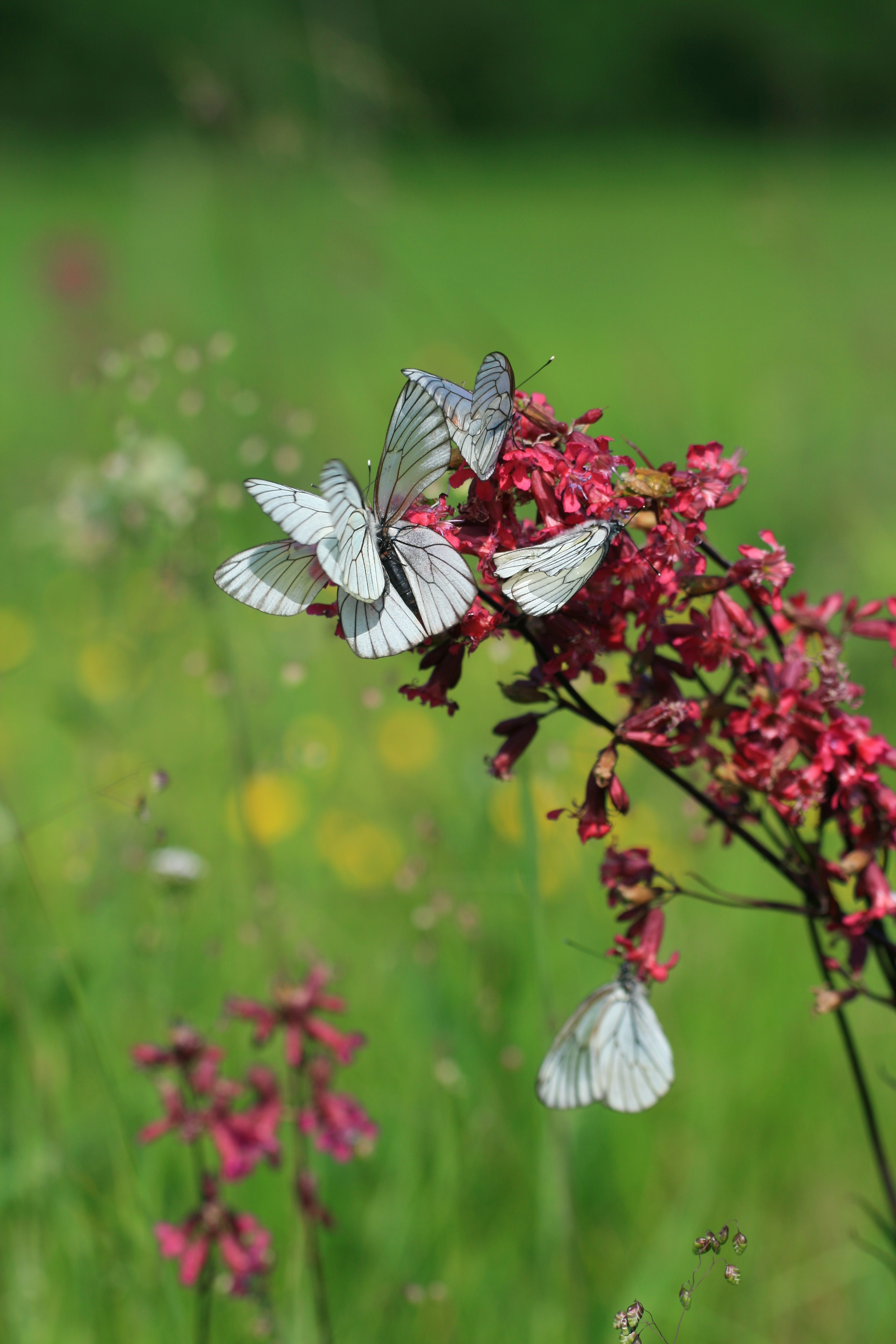 К вечеру бабочки понемногу слетали с дорог на луга и рассаживались по луговым цветам. Вот и тут парочка боярышниц, посасывая нектар из цветков "раковой шейки", сверлят друг друга глазами.......Что бы это значило?!