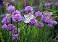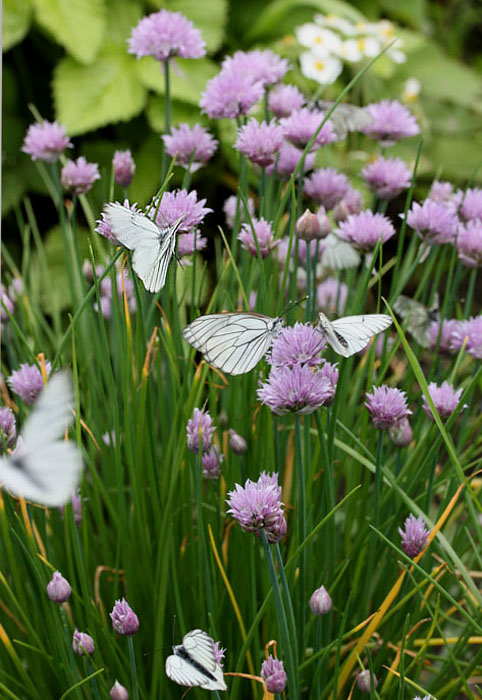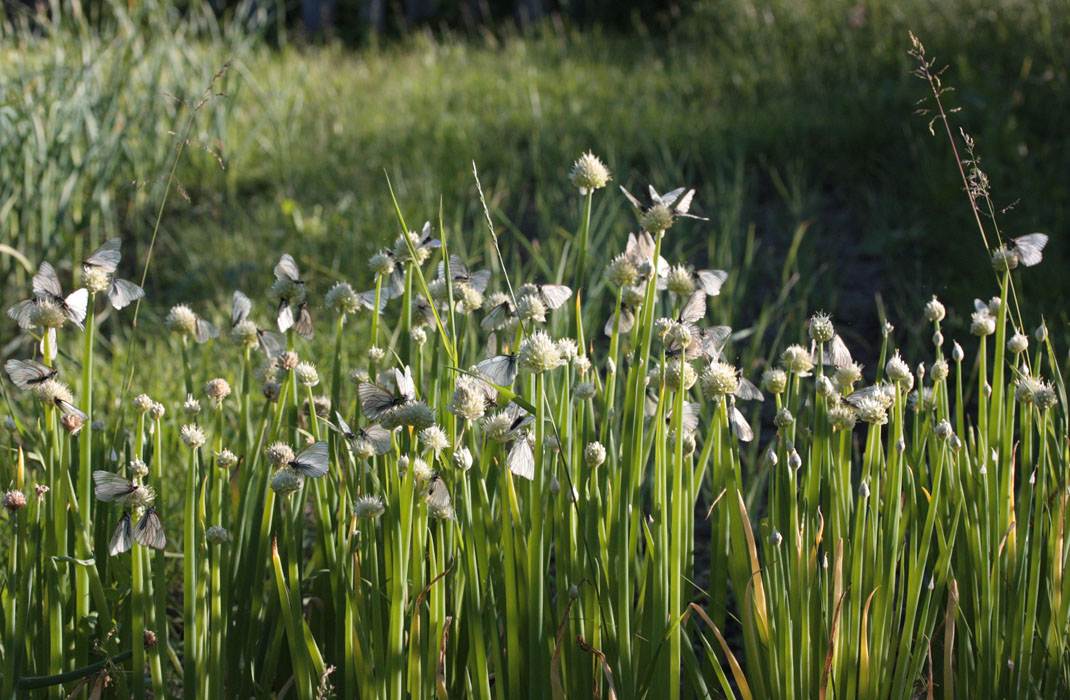 Постепенно мой огород наполнялся этими боярышницами (пока речь идет о луке, а не о боярышнике ). Их становилось все больше, а лука, казалось, становилось все меньше........Удивительное сочетание белых в черную жилку крыльев и белых с крошечными желтыми пыльниками головок лука! И трудно было понять, кто из них цветок в большей мере?! Впечатляющее сочетание изящества и красоты, особенно к вечеру..... в лучах заходящего солнца!