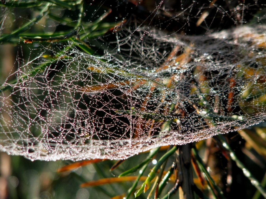 Паутина среди ветвей сосны вся усеяна капельками росы.