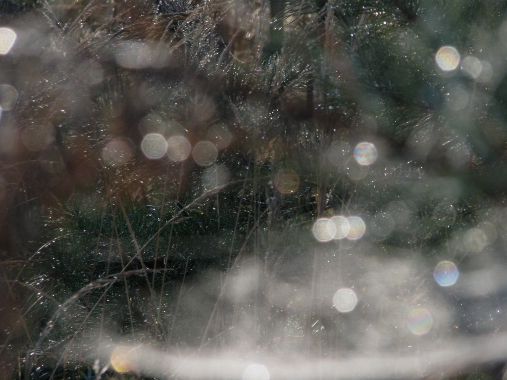 Удивительно теплый октябрьский день. Густой туман пролился обильными росами на землю. Капельки густо легли на листья, повисли на иголка сосен, запутались в паутине. Маленькие линзы преломили солнечные лучи, и все вокруг засияло всеми цветами радуги.