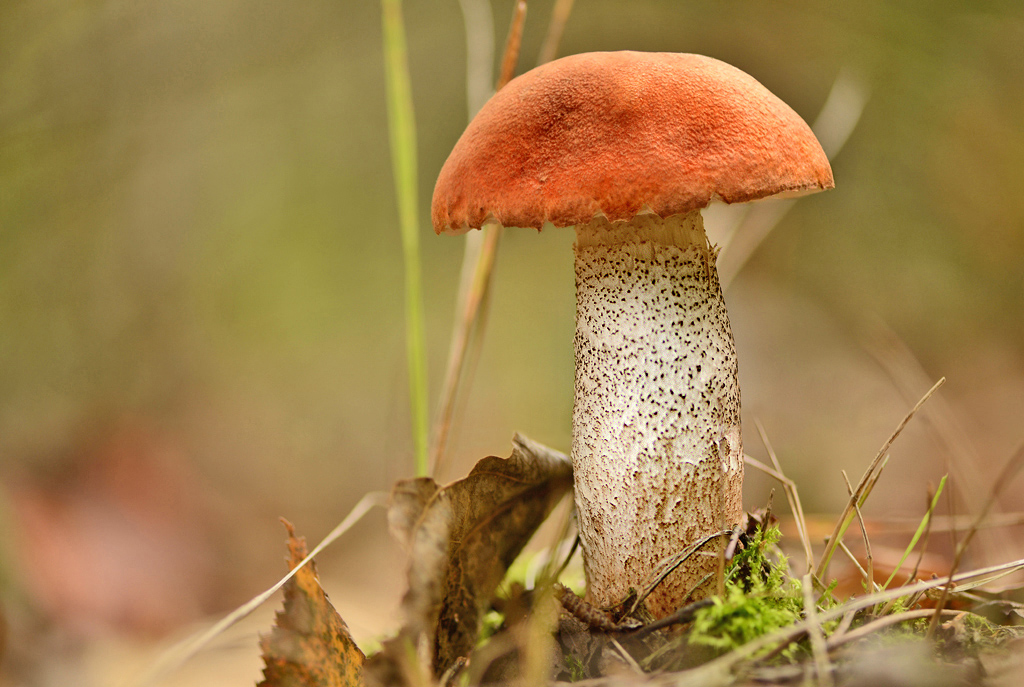 Хочется подчеркнуть яркую окраску шляпки и фактуру ножки. Добавляем на шляпке теней и насыщенности, на ножке еще резкости. Таким образом яркий гриб выделяем на мягком размытом фоне.