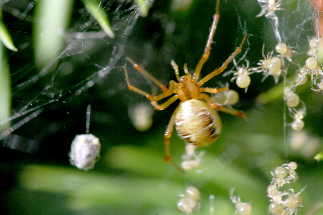 На кусте можжевельника такие же мелкие паучата с мамашей,которая помогает им в добыче корма.Такие же скопления встречаются и на стене дома.