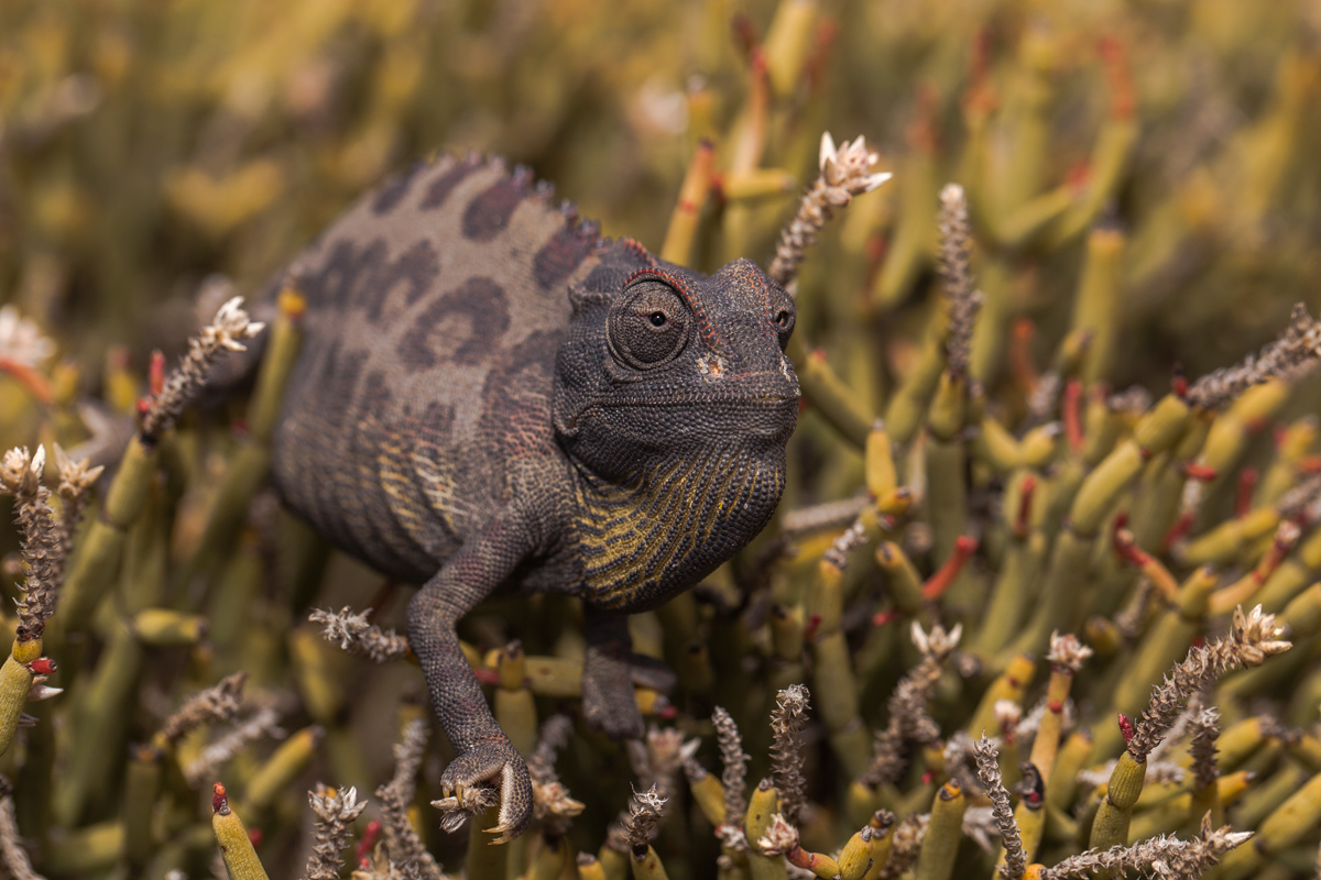 Я видел много разных видов хамелеонов и всех их роднит одно - задумчивость! Это те животные, которые могут занести лапу над веткой, а поставить ее туда через несколько минут. Правда, когда им нужно, они могут быть весьма быстры! Еще думаю многие знают, что они могут смотреть глазами, независимо друг от друга, но если им нужно навестись на цель, они используют бинокулярное зрение. Ну и конечно цвет... Хоть они и не могут стать серо-буро-малиновыми в крапинку(мой подопытный не в счет)))) , общий тон тела у них меняется быстро, что можно проследить на моих фотографиях. Там везде один экземпляр! Кстати самыми яркими и контрастными они становятся перед смертью и во время стресса...