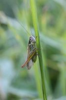 Ну вот, по прошествии времени (думал,что побольше моих коллег поучаствует в определении.........все-таки самообразование и просвещение ), пора поставить (пусть и не все) точки на "и". На фото № 1 изображена довольно крупная личинка певчего кузнечика (Tettigonia cantans Fuess.), а на фото № 2 - крошечная личинка какого-то скачка, по-видимому,скачка Розели, который здесь встречается чаще. На фото № 3 - самец скачка короткокрылого (Metrioptera brachyptera L.), с прекрасной "игралкой" на спине и щелочками "ушей" на передних лапках.