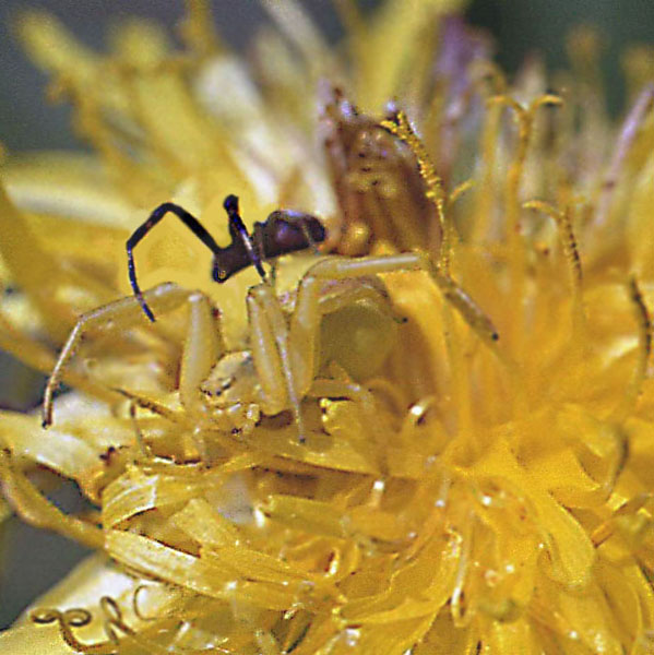 Паук мизумена (Misumena vatia Cl.),отр.Пауки (ARANEI),сем.Крабовые или бокоходы (Thomisidaе). Своеобразный хамелеон в мире пауков. Меняет свой цвет под субстрат...много полностью желтых пауков на желтых цветах,есть зеленоватые на зелени, а в основном белые. А есть,оказывается, и вот такие "сборные" ......они у нас в Макроиде имеются. Была и дискуссия по поводу специфической красной пятнистой окраски (см. фото и комм. Dima DD в альбоме).