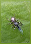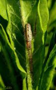 Обычно, на наших кустах и ветвях деревьев, постоянно встречается L. montana L., делающая свои тенета (горизонтальный полог, поддерживаемый сверху и снизу горизонтальными нитями). Сам паук (самка) сидит под пологом (некоторые виды в укромном местечке) и ожидает падения на него мелких насекомых............ цикадок, комаров, крылатых тлей, которых и выкусывает из полога. Так живет L. montana, которую я постоянно и встречал у нас по жизни. И эта линифия, что изображена на снимке, вроде бы, не отличается образом жизни от описанного паучка, но вот в чем заковыка........Во - первых, цвет и рисунок спины иной (желтоватый к тому же), а во-вторых, отсутствие щетинок на бедрах ног, что присутствует у большинства линифий. Есть и другие мелкие отличительные признаки. А вот в интернете и у нас в Макроиде - полная неразбериха с этим пауком, хотя снимки и есть. Каких только видовых названий нет. И у нас в каталоге появился род Neriena, о наличии которого я отродясь не слышал в славном сем. Linyphiidae, и даже умудряются относить паука к сем. Tetragnathidae, пауков вязальщиков ???! Да и не мудрена эта "карусель", поскольку в семействе линифиид около 100 видов, до 30 родов и в роду линифия более 10 видов.