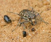 Тут мне повезло, нашел место, где на 2-3 сотках живет несколько десятков скакунов этого вида, и находятся несколько муравейников, остаётся выбрать жука поспокойней и дождаться, кога в радиусе 10-15 см от него пробежит муравей. А потот успеть нажать на спуск. Кстати, наблюдал кратковременные стычки между скакунами из-за добычи, причем из-за территории они не враждуют, бывает, 3-4 особи делят клочок площадью пару кв.дециметра.