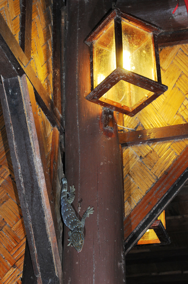 Эти очень забавные ящерицы - токи - живут в Лаосе в человеческих постройках. Ночью выходят на охоту вместе с гекконами, очень ловко ловят насекомых. На первом снимке токи на телевизоре в местном кафе. На втором - под фонарем в кемпинге, только что съел при мне крупного кузнечика, так что в его реальности сомневаться не приходилось:))