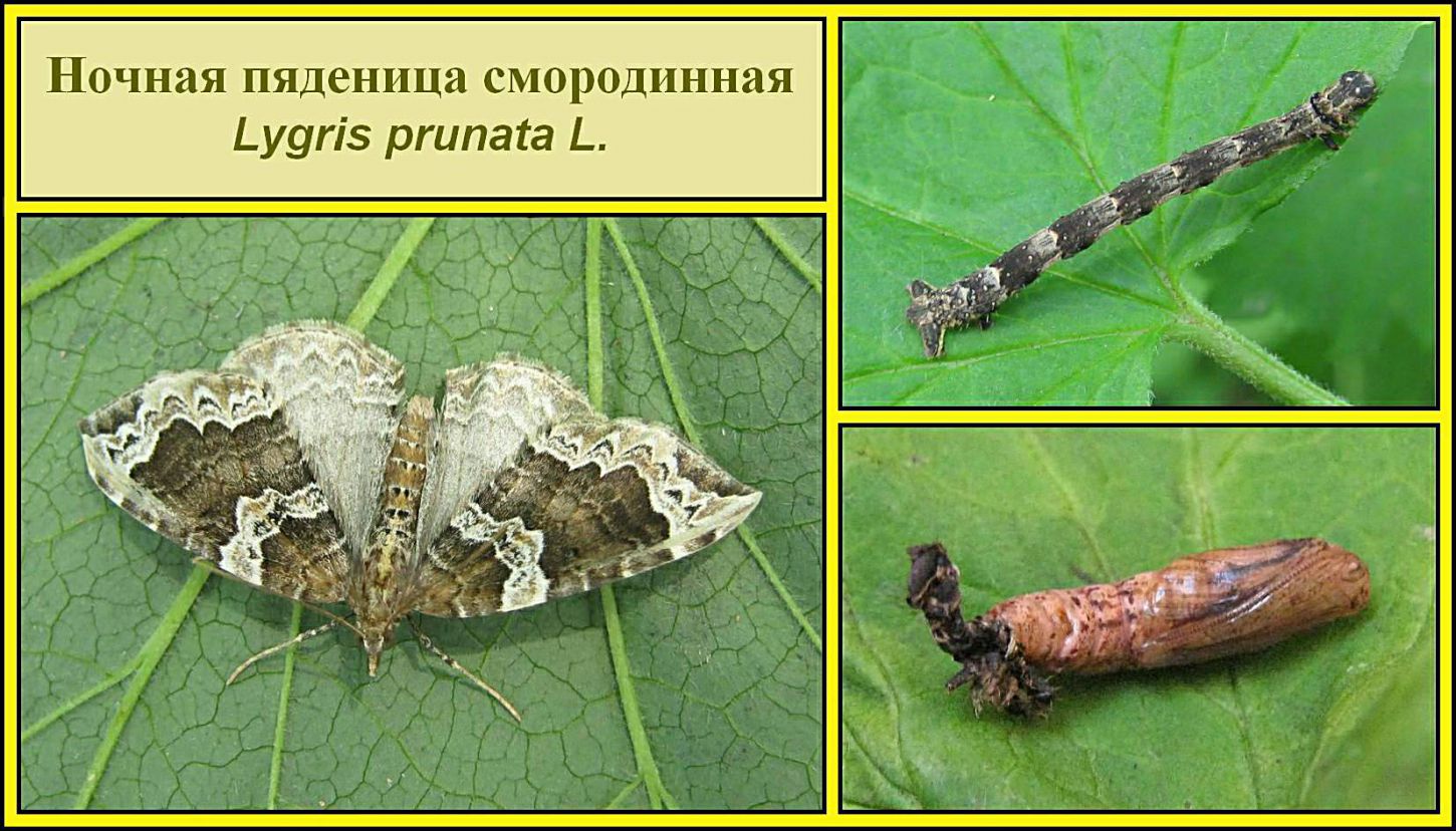 На фото изображены бабочка, куколка и гусеница пяденицы смородинной