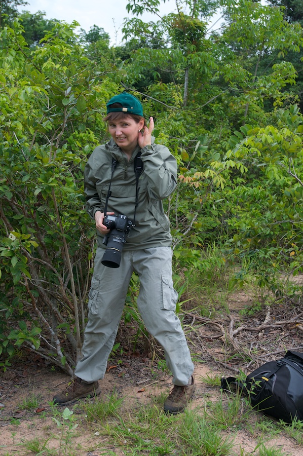 Уже на маршруте движения к лагерю нам попадалось довольно много насекомых. Конечно бабочки были великолепны, именно здесь первый раз мы и увидели Морфо. Но ей я хочу посвятить отдельную серию :-) На снимке Наташа Гераськина и Siproeta stelenes.